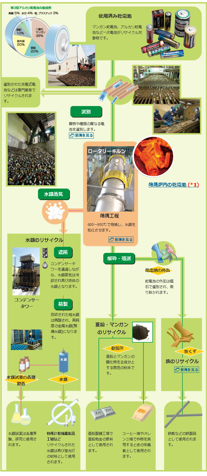 焙焼後、乾電池の外缶は鉄製品へ、亜鉛滓は土壌改良剤や亜鉛地金へ生まれ変わります。